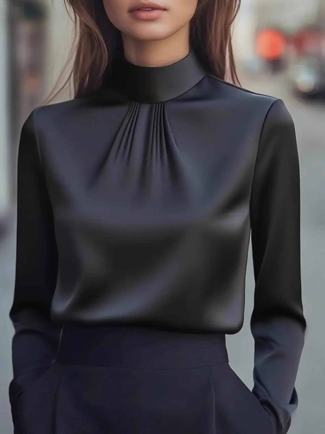 Mock Neck Long Sleeve Blouse With Pleated Detail