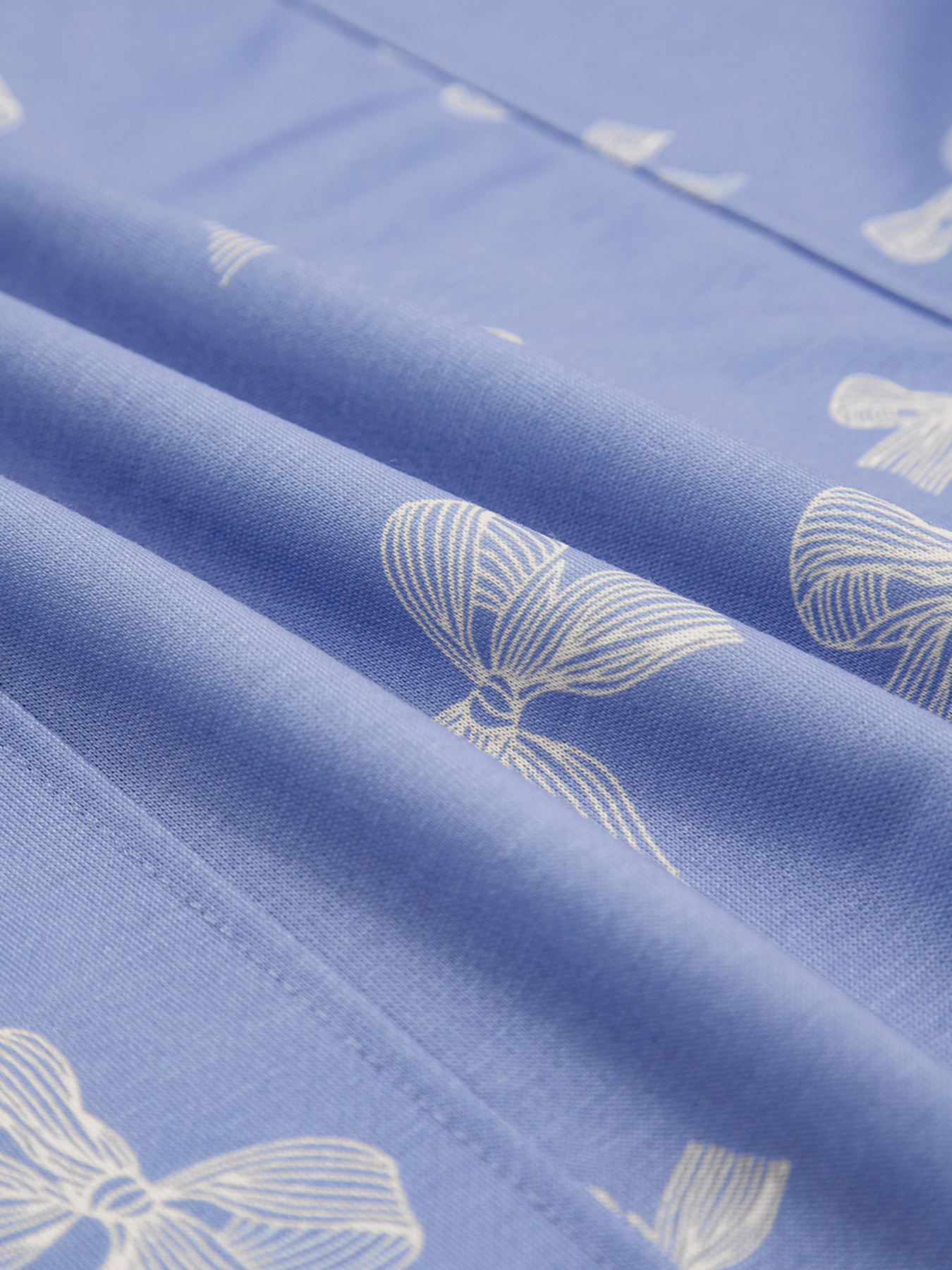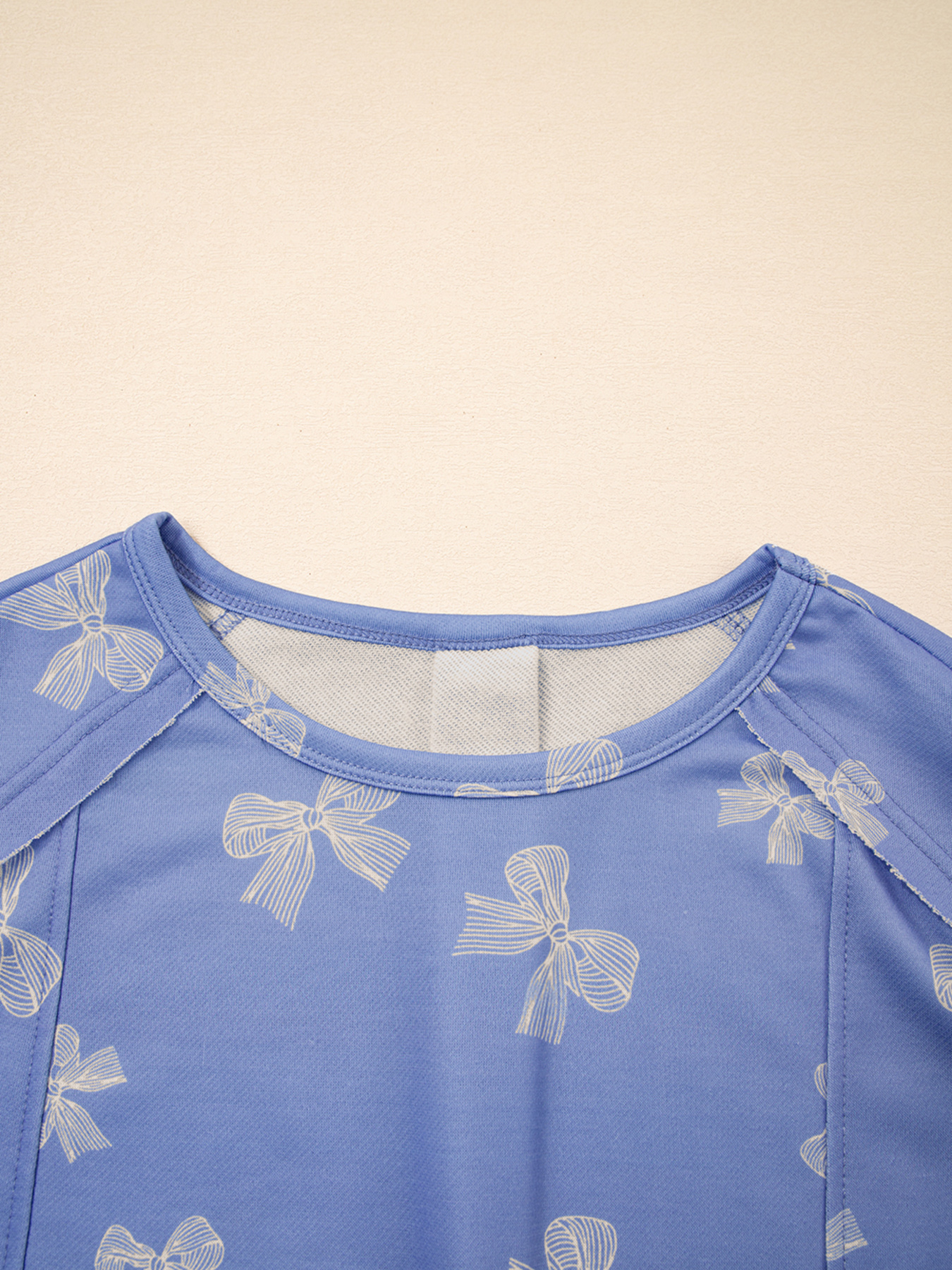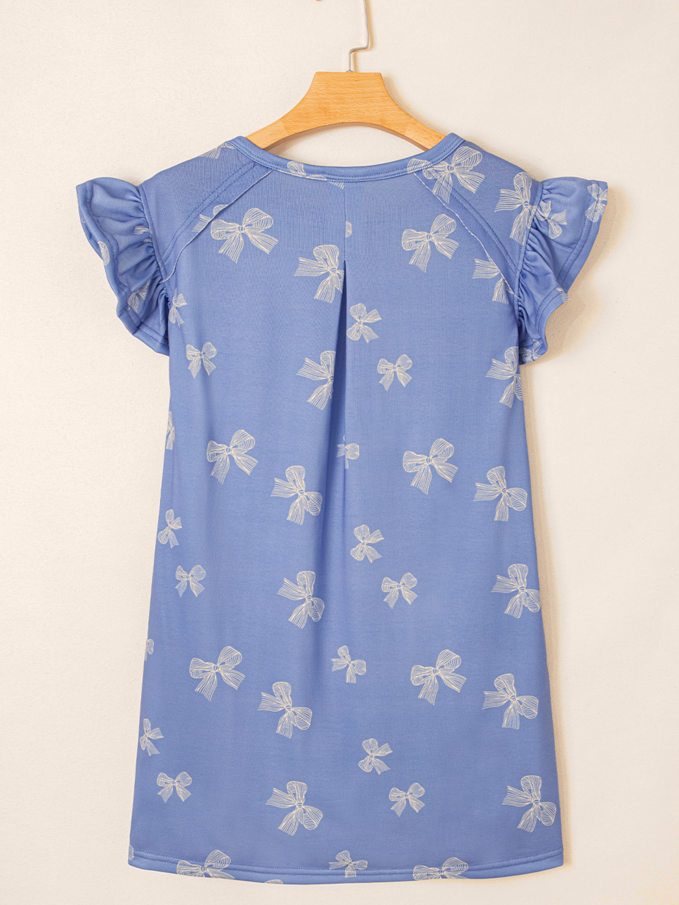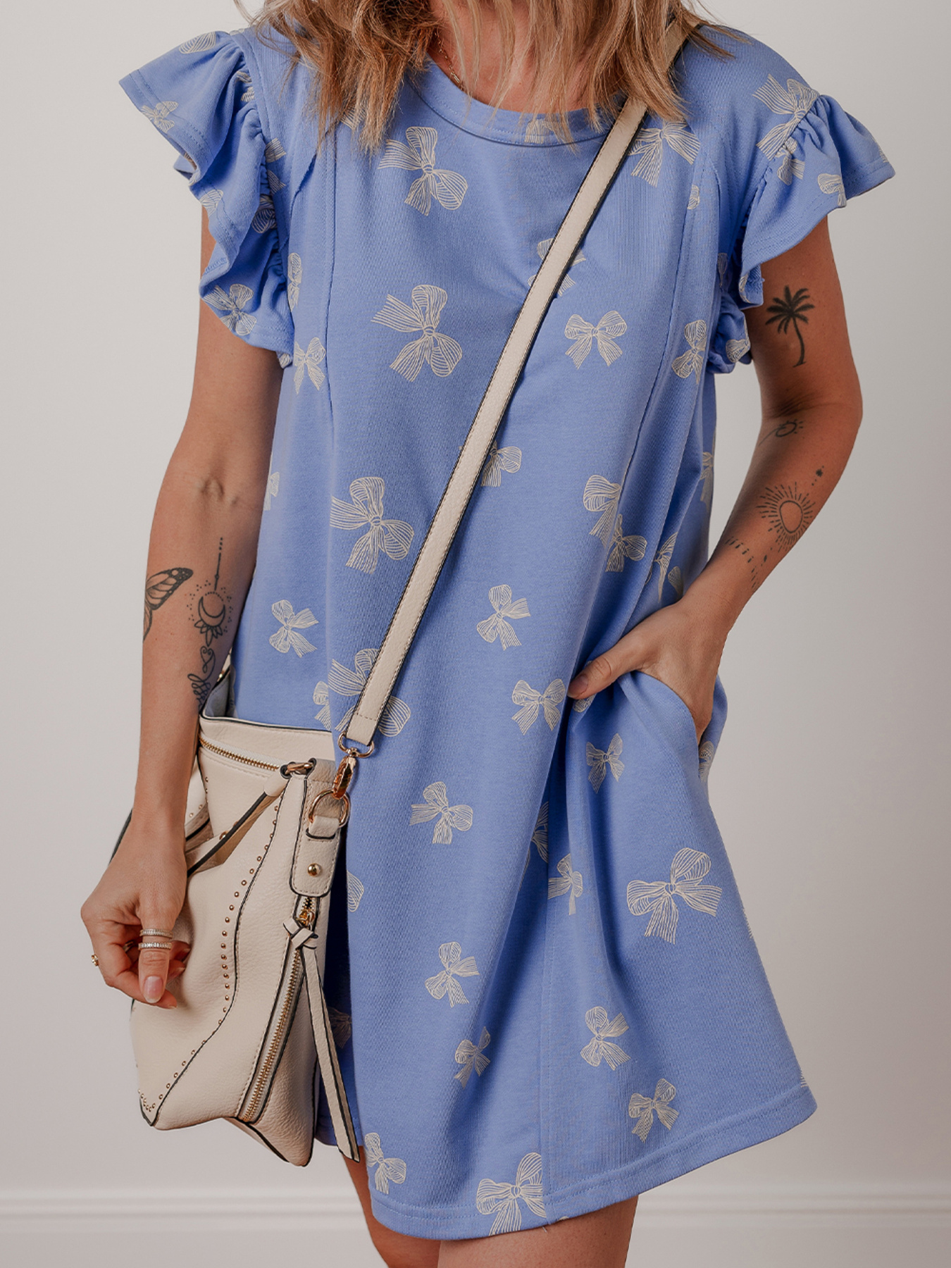 Bow Knot Print Crewneck Ruffled Sleeve Shift Mini Dress