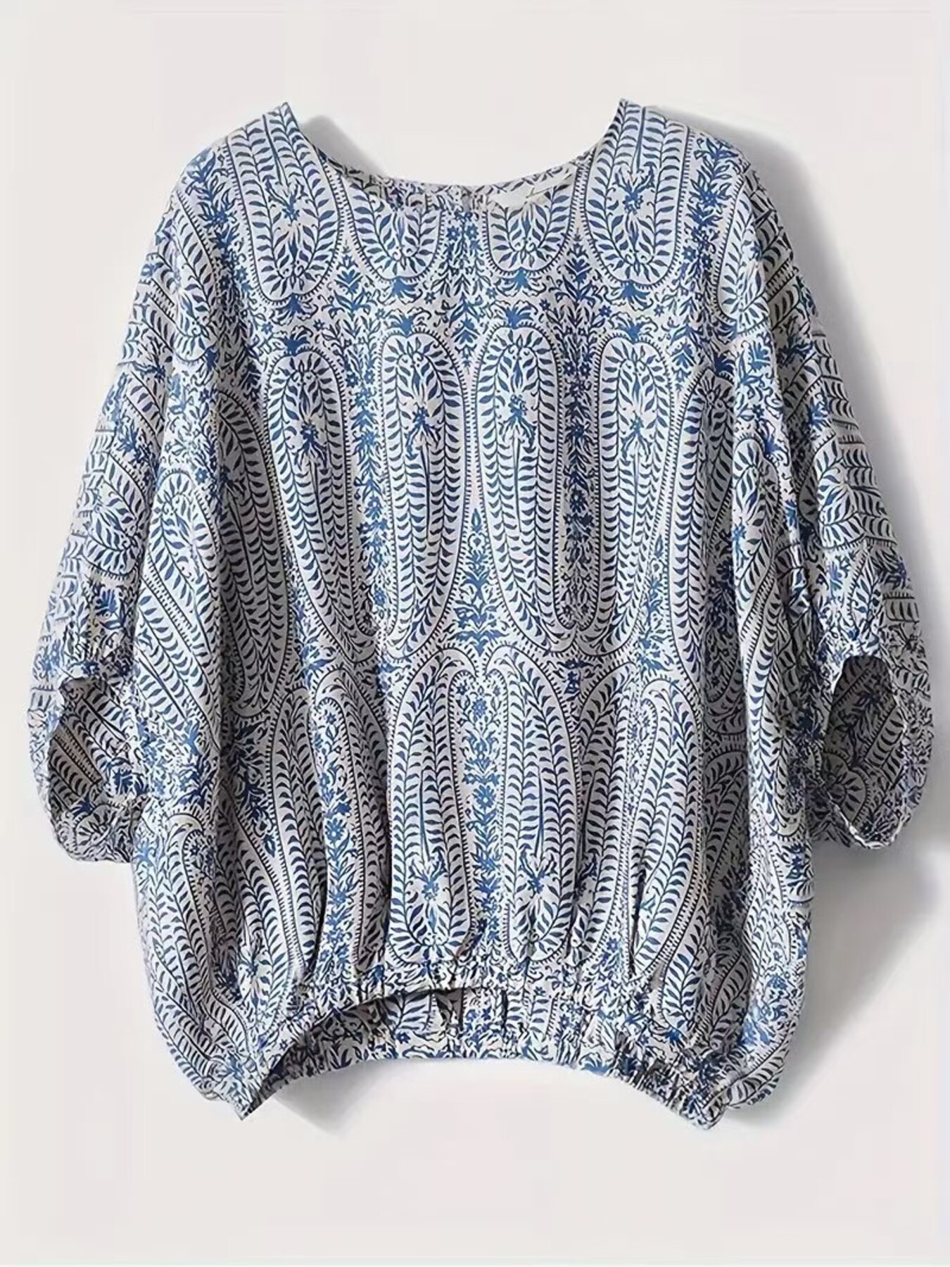 Bohemian Print Round Neck Loose Batwing Sleeve Blouse