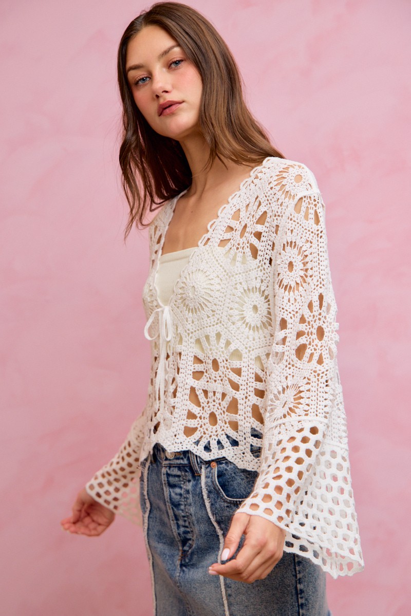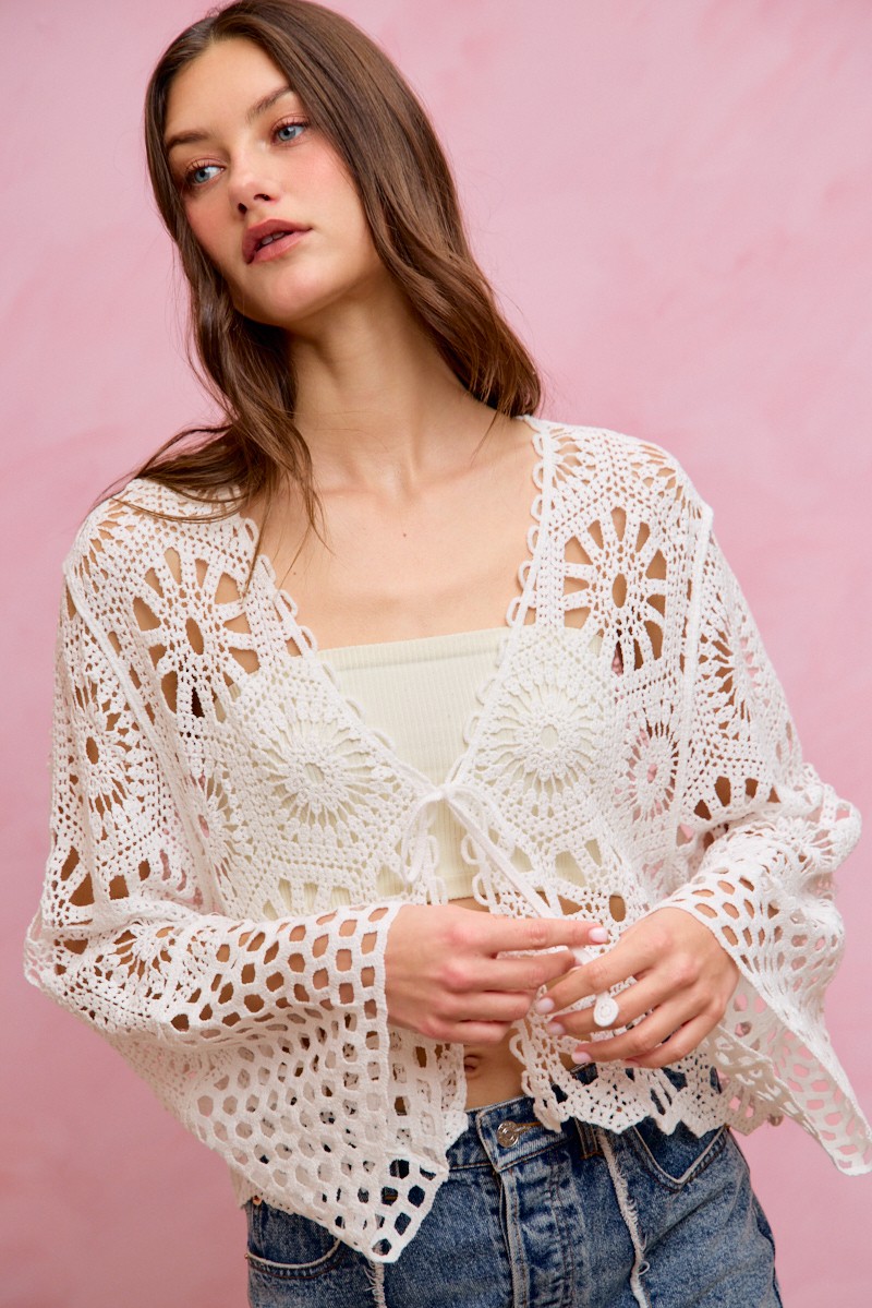 So Me Floral Pattern Crochet Knit Tie Front Crop Cardigan