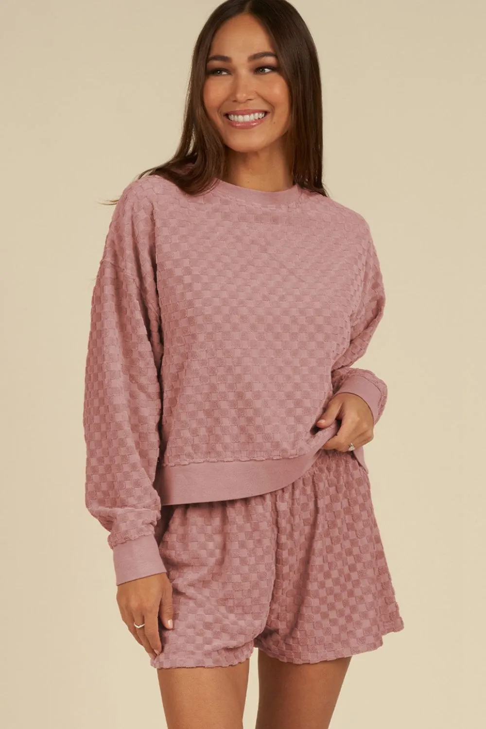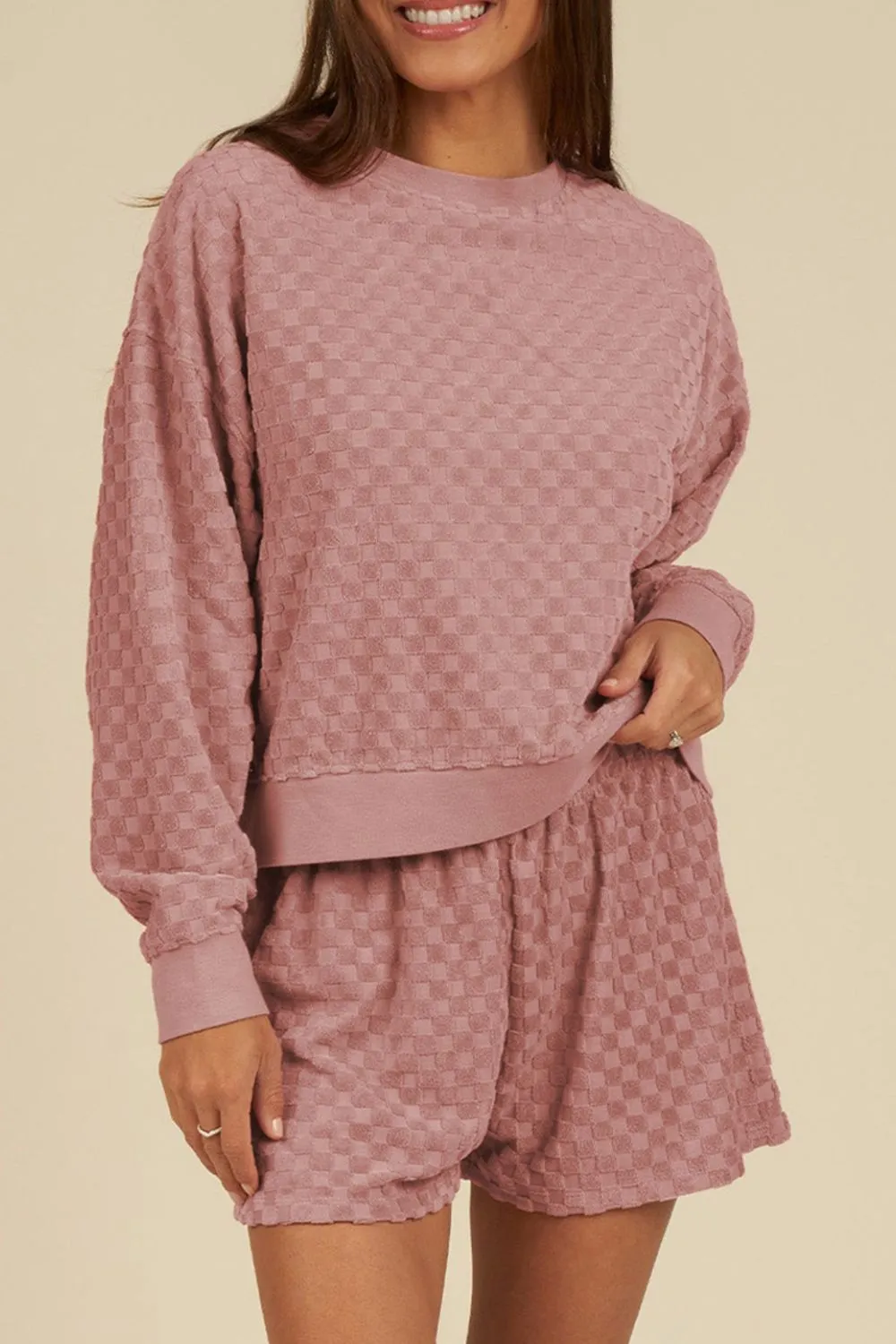 Round Neck Long Sleeve Checkered Top And Shorts Set