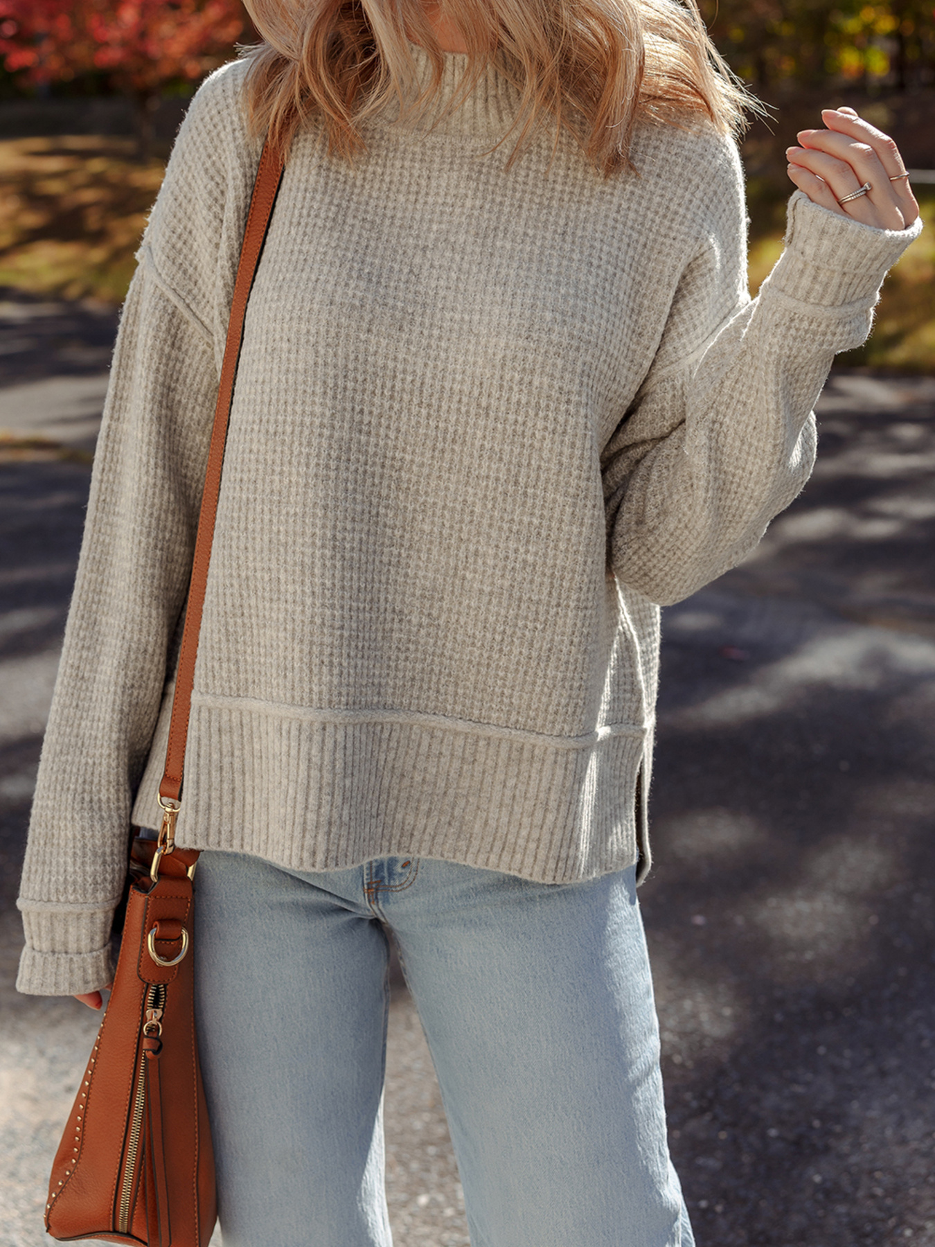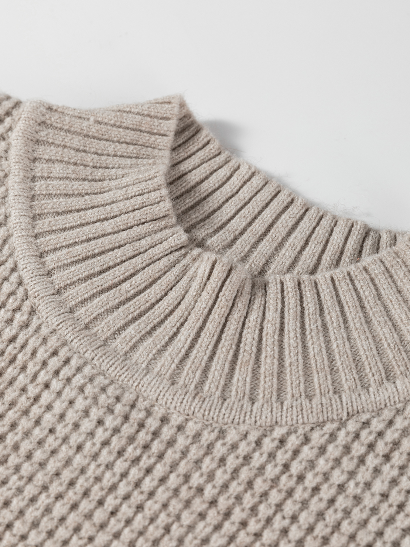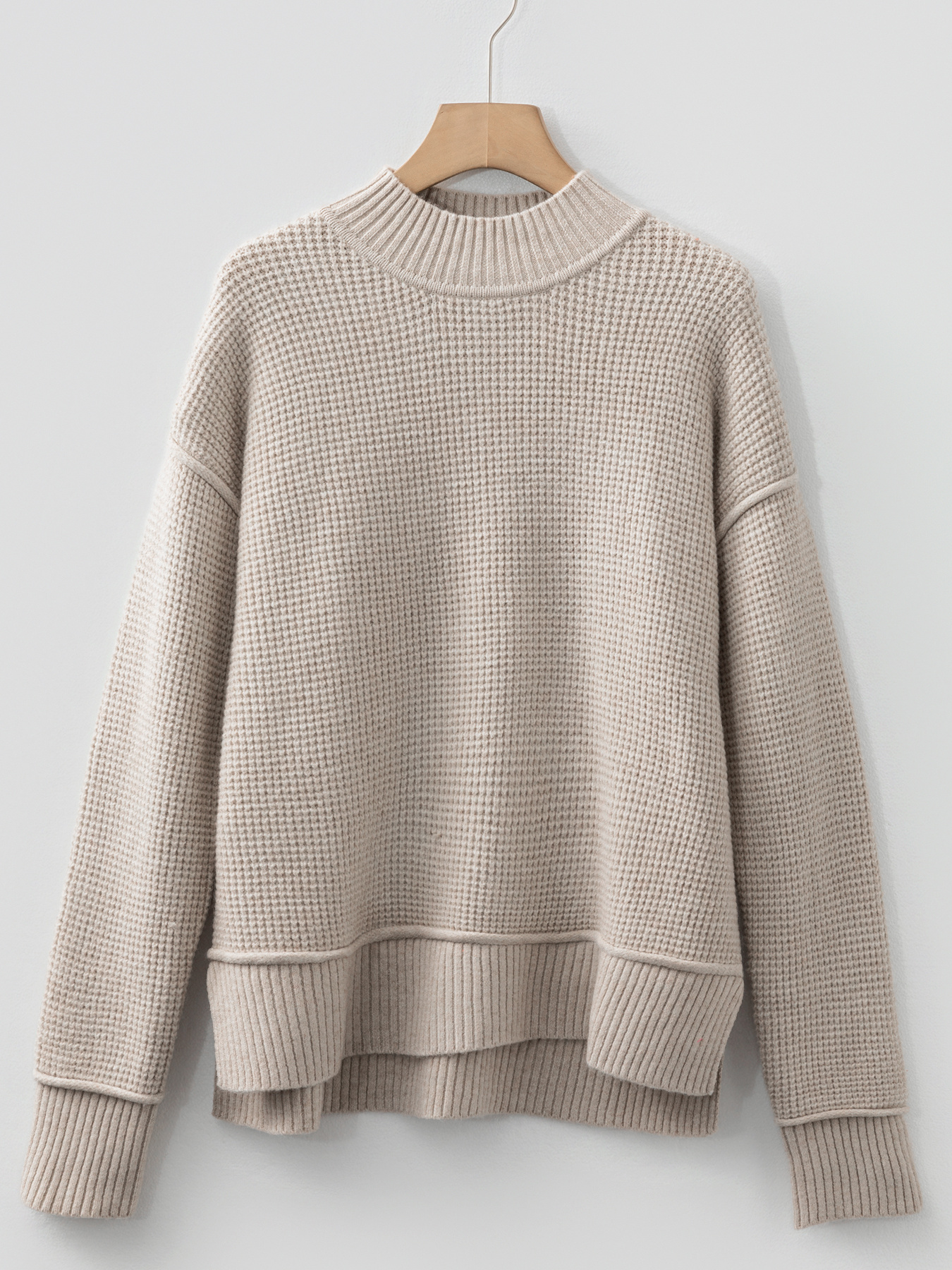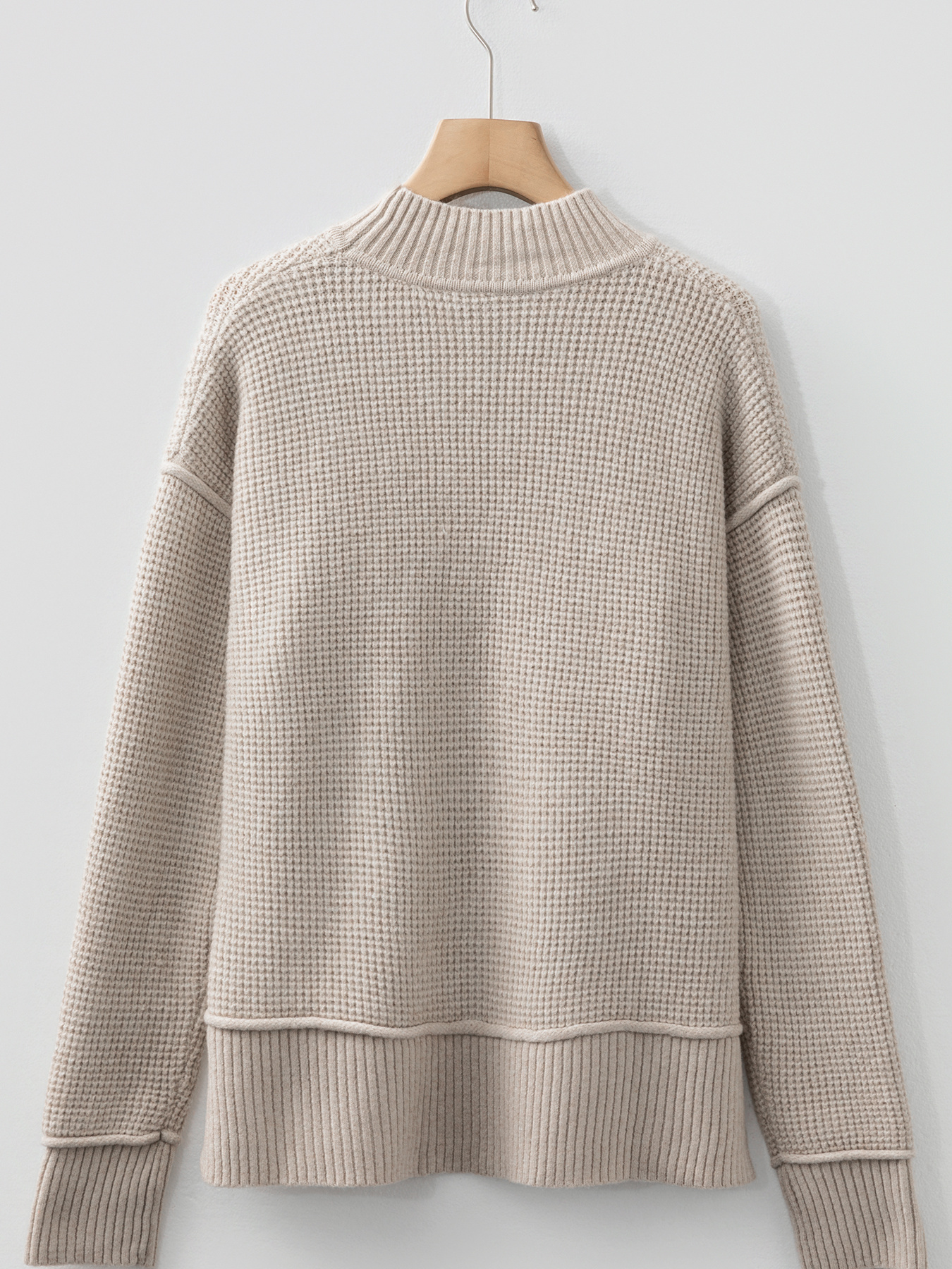 Waffle Texture Knit Ribbed High Neck Drop Shoulder Sweater