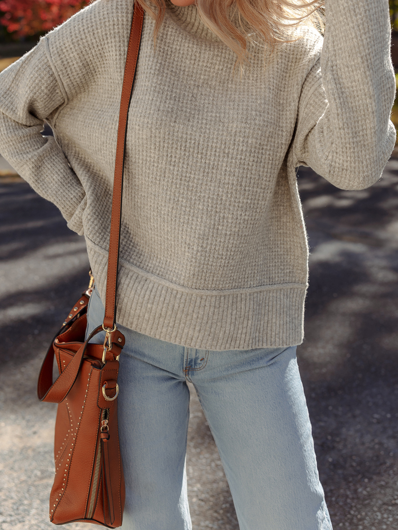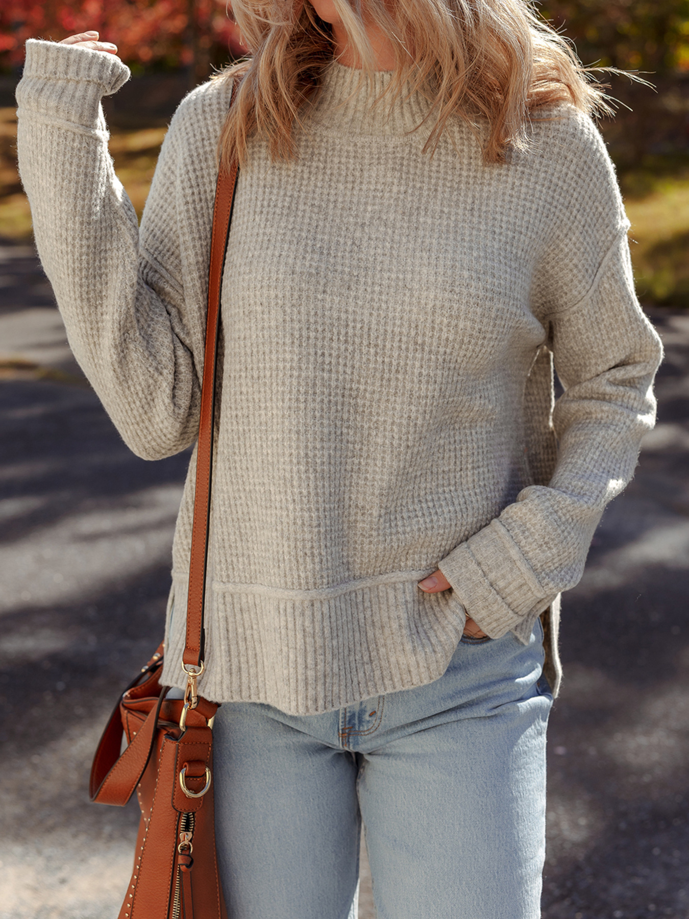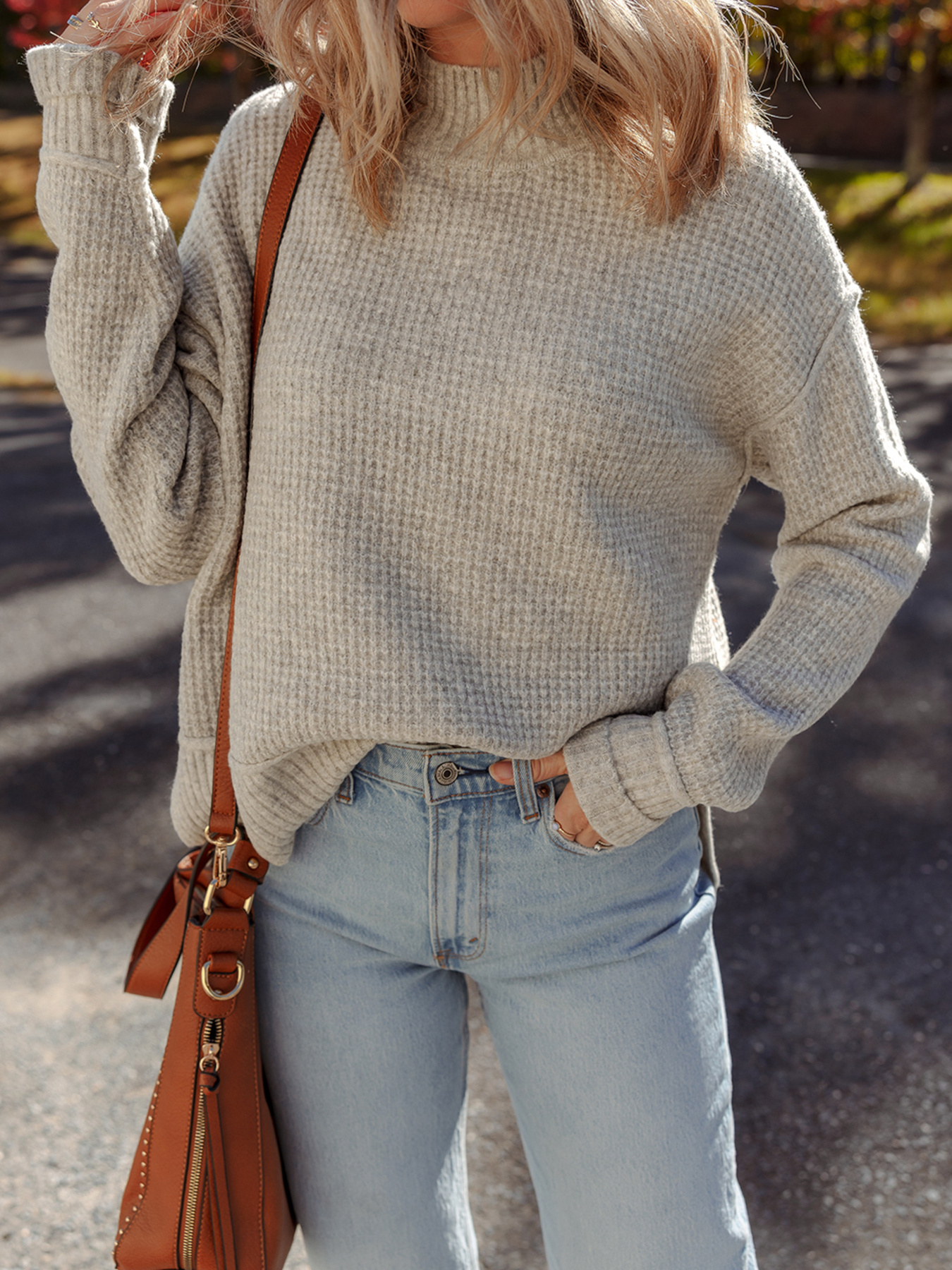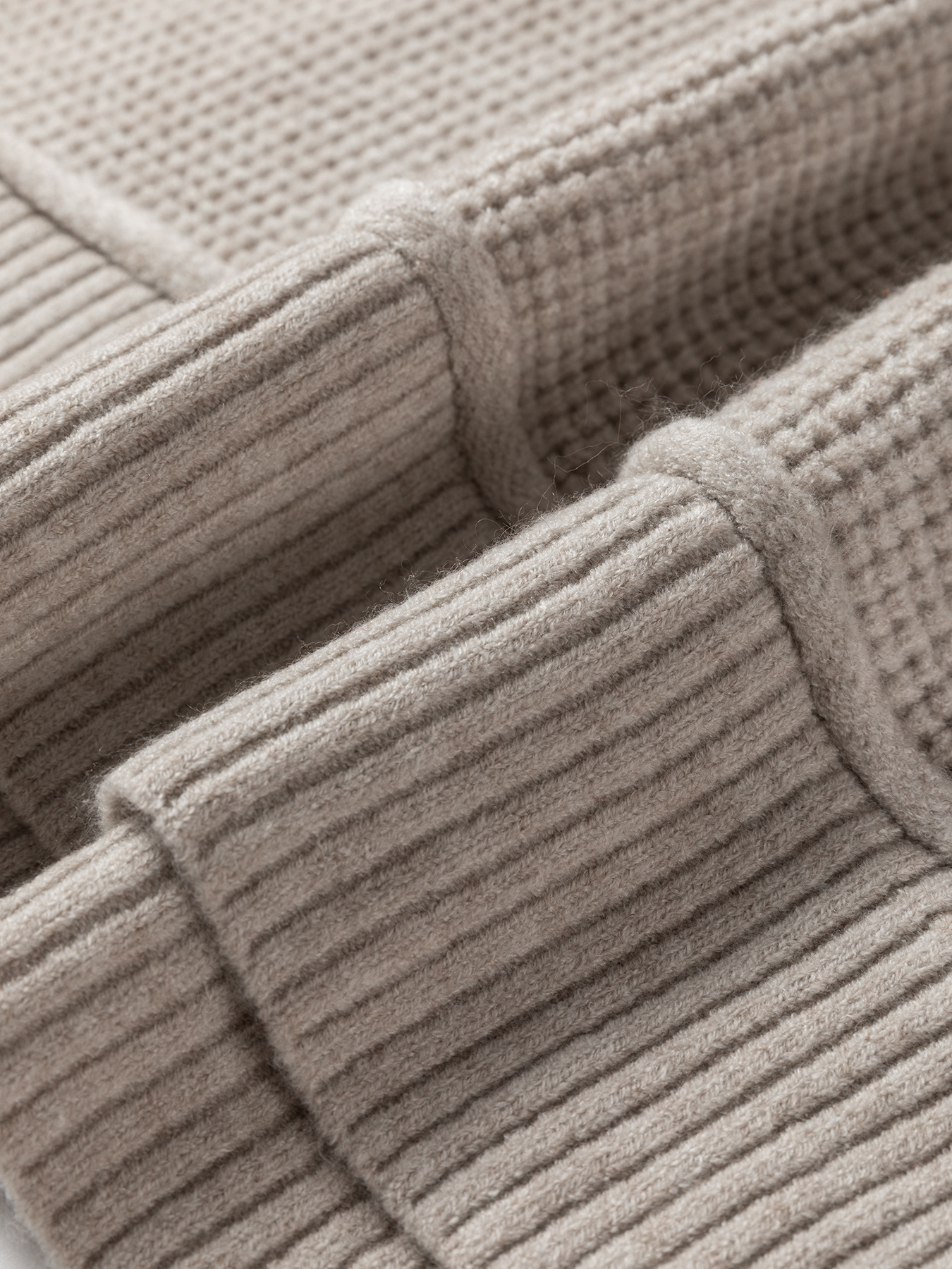 Waffle Texture Knit Ribbed High Neck Drop Shoulder Sweater