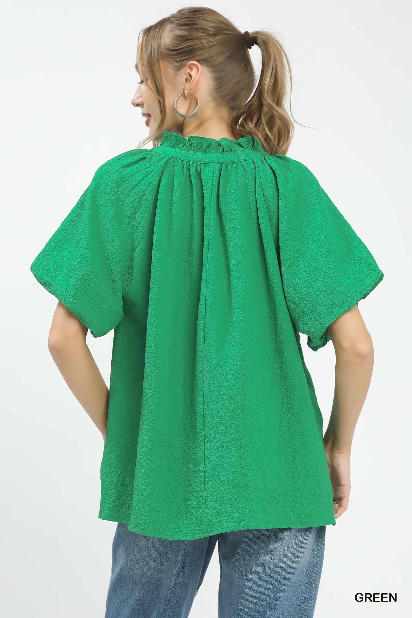 Umgee Puff Sleeve Ruffle Neck Tunic Blouse