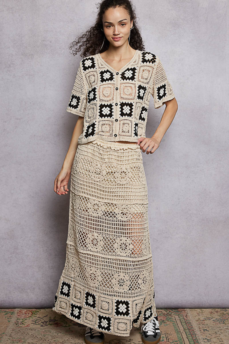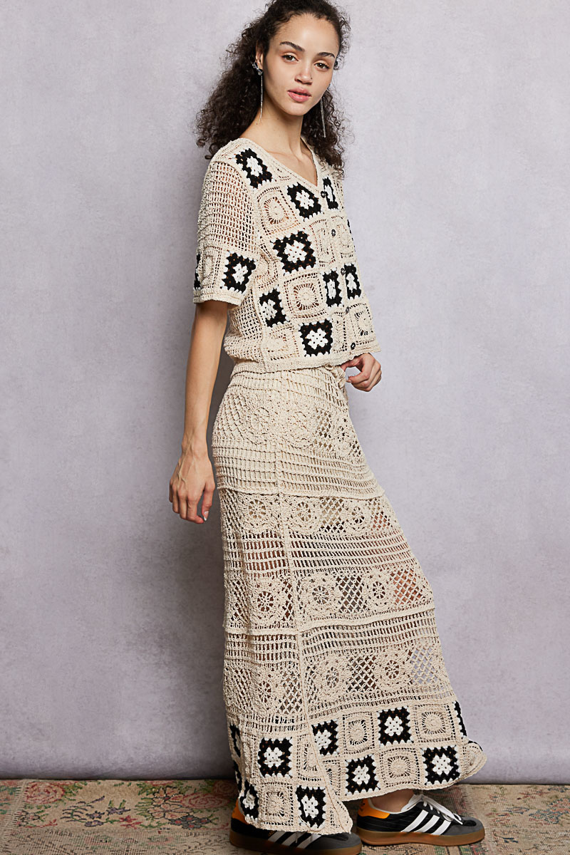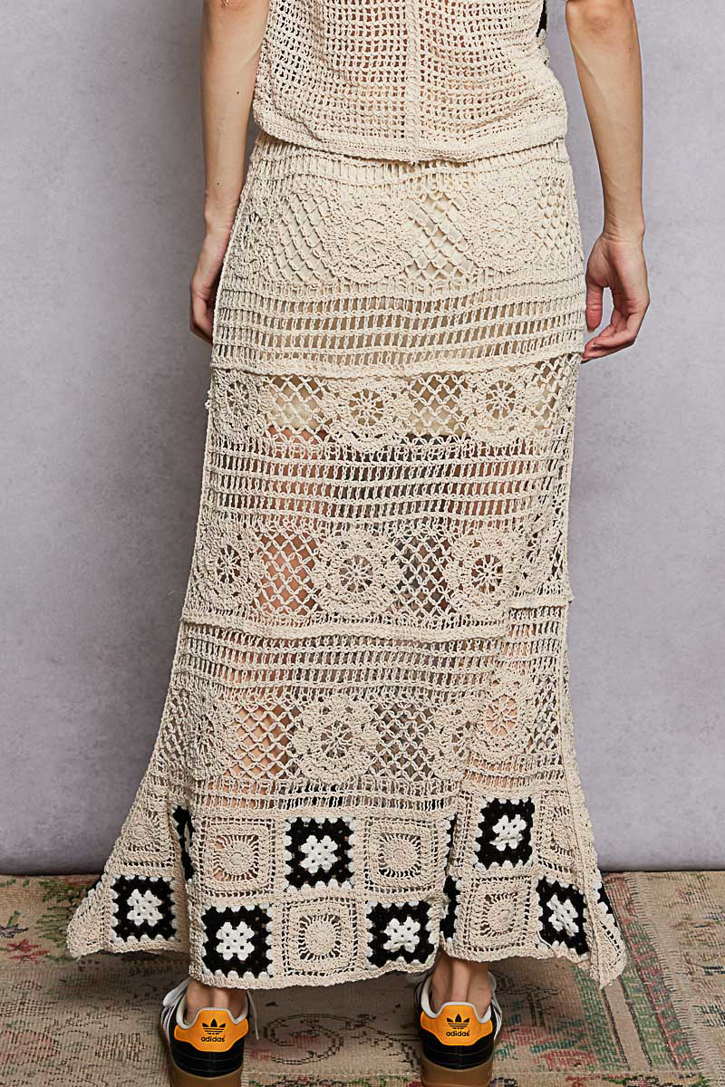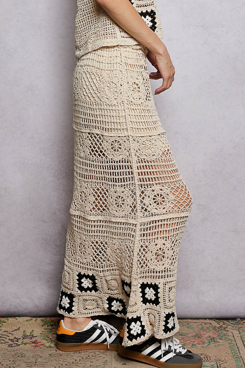 Pol Floral Crochet Ruffled Waistband Maxi Skirt With Granny Square Weave