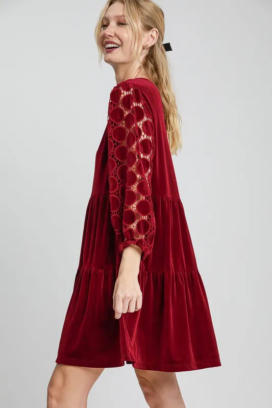 Umgee Dotted Lace Sleeve Tiered Velvet Mini Dress